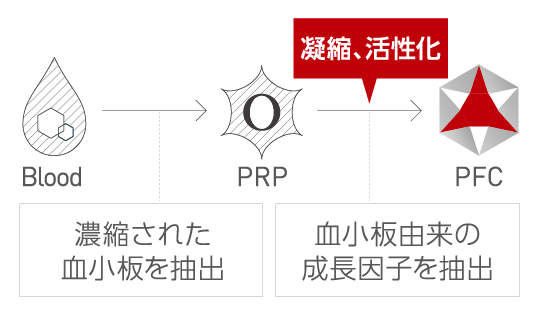 血液から多血小板血漿(PRP : Platelet-rich plasma)を作製し、そこに含まれる成長因子を活性化させたものを濾過し、残っている細胞を除去します。その液を凍結乾燥させたものが「PFC-FD™」になります。